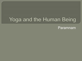 This document discusses the concept of paramnam, which refers to the infinite mind. It explores how the mind is colored by past experiences and influences our lives by either limiting possibilities or recognizing them. It then uses the seven chakras as guidelines for increasing self-awareness and presence. Each chakra represents a question about the self, relationships, abilities, authenticity, expression, higher mind, and universal connection. Techniques like asana, pranayama and meditation can help consciously face habits and emotions. The overall aim is to awaken one's full awareness, recognize it, refine it and expand it to our unlimited potential.