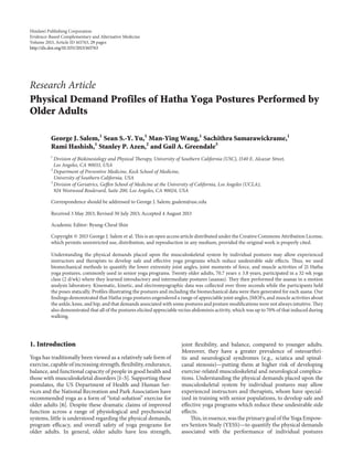 This document describes a study that quantified the physical demands of 21 Hatha yoga postures commonly practiced by older adults. Twenty older adult participants completed a 32-week yoga intervention, where they learned introductory postures for the first 16 weeks and intermediate postures for the second 16 weeks. Biomechanical data including joint angles, joint moments of force, and muscle activation levels were collected while participants statically held each posture. The results provide physical demand profiles for each posture that illustrate the ranges of motion, efforts required to maintain the poses, and activated muscle groups. These profiles can help instructors design safe and effective yoga routines for seniors.