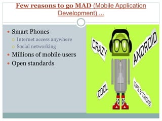 The document outlines the benefits and features of mobile application development (MAD), highlighting its importance due to widespread smartphone usage and internet access. Siskh Technologies specializes in creating both product-based and marketing-based mobile applications for various industries, aiming to enhance customer engagement and brand awareness. Key offerings include a yoga therapy app and a personalized prescription reminder app, with a focus on delivering cost-effective solutions across mobile platforms.