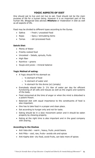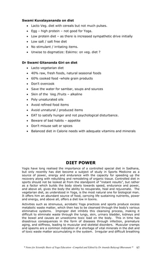 The document discusses the significance of a balanced vegetarian diet in yoga and sports, emphasizing moderation and the types of foods beneficial for physical and mental well-being. It highlights the importance of hydration, the dangers of consuming processed and animal-based foods, and the benefits of raw and unprocessed options for energy and health. The text advocates for a clean lifestyle alongside a proper diet to enhance overall strength, endurance, and longevity.