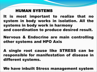 Yoga therapy aims to treat the root cause of illness and promote overall well-being through integrated practices that address the physical, mental, emotional, and spiritual aspects of a person. It uses techniques like asanas, pranayama, meditation, and lifestyle modifications to reduce stress, strengthen the body and mind, and bring the different systems of the body into harmony. Yoga therapy treats the whole person, not just the symptoms, and can help prevent disease when practiced regularly as part of one's lifestyle. It works slowly but is safe and can complement other medical treatments for various chronic conditions like diabetes, hypertension, and respiratory disorders.
