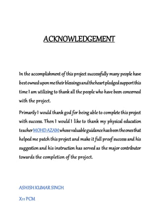 The document is a certificate and project submitted by Ashish Kumar Singh of Class 12 on the topic of yoga. It includes an introduction, types of yoga like Hatha yoga and Raja yoga, importance of yoga, and asanas. The project was completed under the guidance of his physical education teacher Mohd Azam and found worthy of acceptance for his physical education subject.