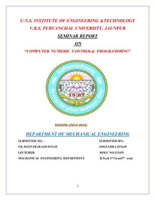 This document is a seminar report submitted by Yogendra Singh, a 3rd year B.Tech student of Mechanical Engineering at Uma Nath Singh Institute of Engineering & Technology. The report covers Computer Numeric Control (CNC) and programming, and includes sections on introduction, definitions, CNC operation principles, safety equipment, programming codes and examples. It also includes acknowledgments and certification that the student presented the seminar in partial fulfillment of his degree requirements.