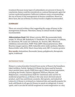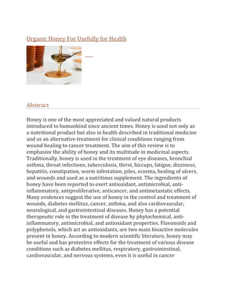 This document discusses the potential health benefits of honey based on its various bioactive compounds and properties. It reviews evidence that honey may be useful in managing several diseases due to its antioxidant, anti-inflammatory, antimicrobial, and other therapeutic effects. The document concludes that there is sufficient evidence to recommend the use of honey in disease treatment and for it to be used more widely in clinical settings.