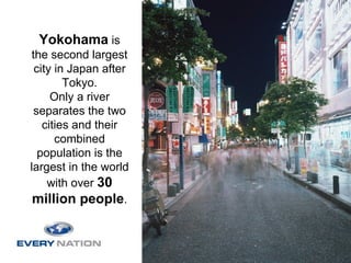 Yokohama is the second largest city in Japan located on the west side of Tokyo Bay. As one of Japan's busiest ports, it is a major commercial hub with a population over 30 million when combined with neighboring Tokyo. The Yokohama Grace Bible Church is led by Pastor Scott and Naomi Douma, and they request prayers for wisdom, provision, and blessing as they lead the church during an economic downturn. They also ask for prayers regarding training Japanese leaders, their church facility, growing marriages and families in the congregation, and increasing fruitfulness in their university outreach programs.