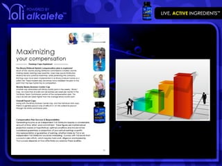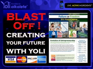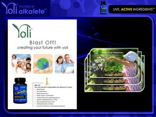 YOLI helps people live healthier lives by providing health products and ingredients, and teaching people how to take control of their lives. It is a multimillion dollar business platform operating in the US, Malaysia, and Asia. The document discusses YOLI's compensation plan which offers many ways to earn money including retail profits, bonuses for starting fast and breaking even, team commissions, matching bonuses, and incentive trips. It promotes the benefits of the business like flexibility, tax advantages, and unlimited income potential.