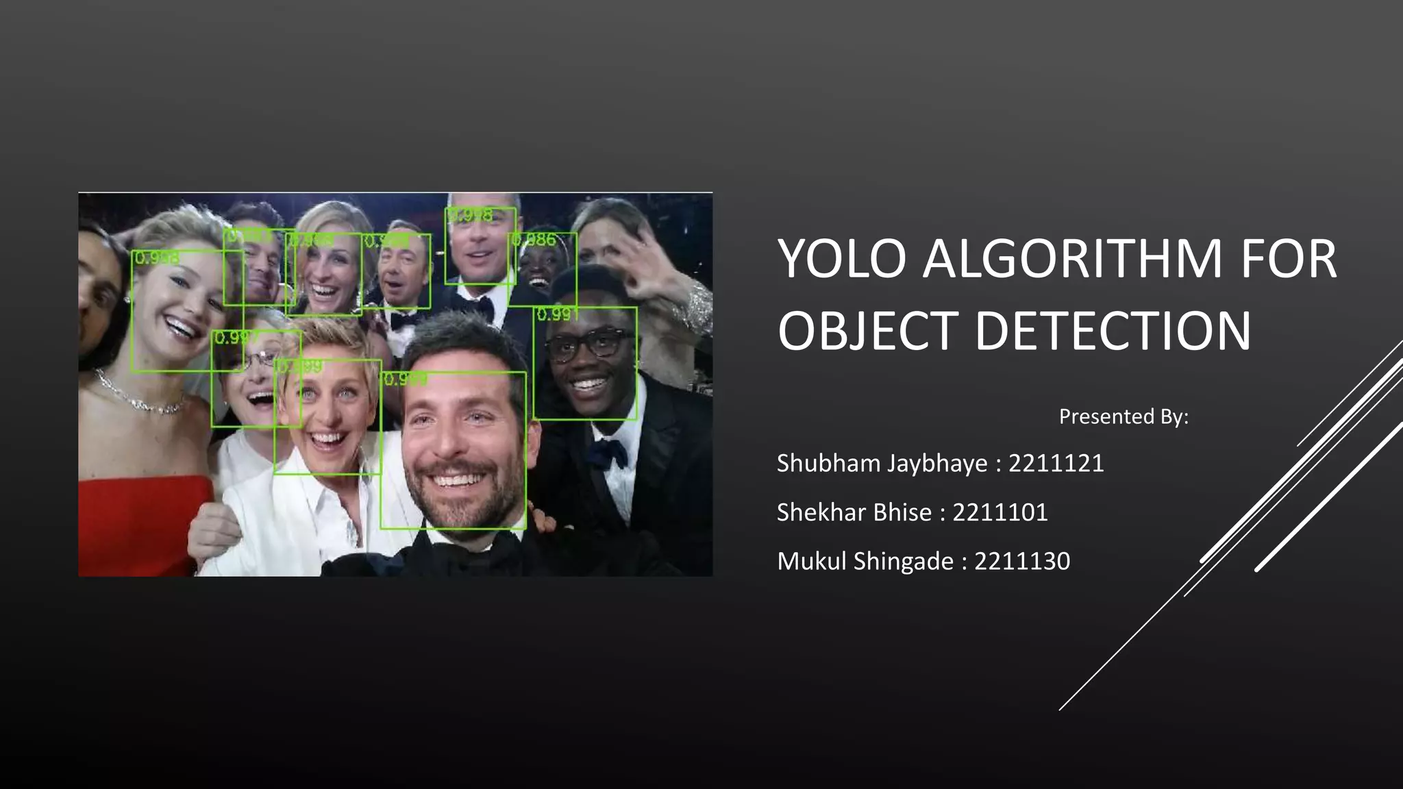 The document discusses the YOLO algorithm for object detection, including definitions of object detection and various detection stages. It details the workings of YOLO, its architecture, and different versions such as YOLOv2, YOLO9000, YOLOv3, and YOLOv4+. Additionally, it highlights the importance of the YOLO algorithm and provides a performance comparison.