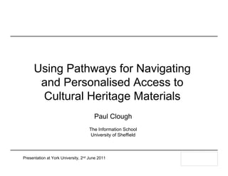 The document discusses personalized access to cultural heritage materials, emphasizing pathways for navigating these resources. It highlights the challenges users face in navigating vast online information and outlines research projects aimed at improving user experiences through personalization and recommender systems. The initiative involves collaboration among multiple universities and cultural heritage organizations to create tailored pathways that enhance knowledge discovery.