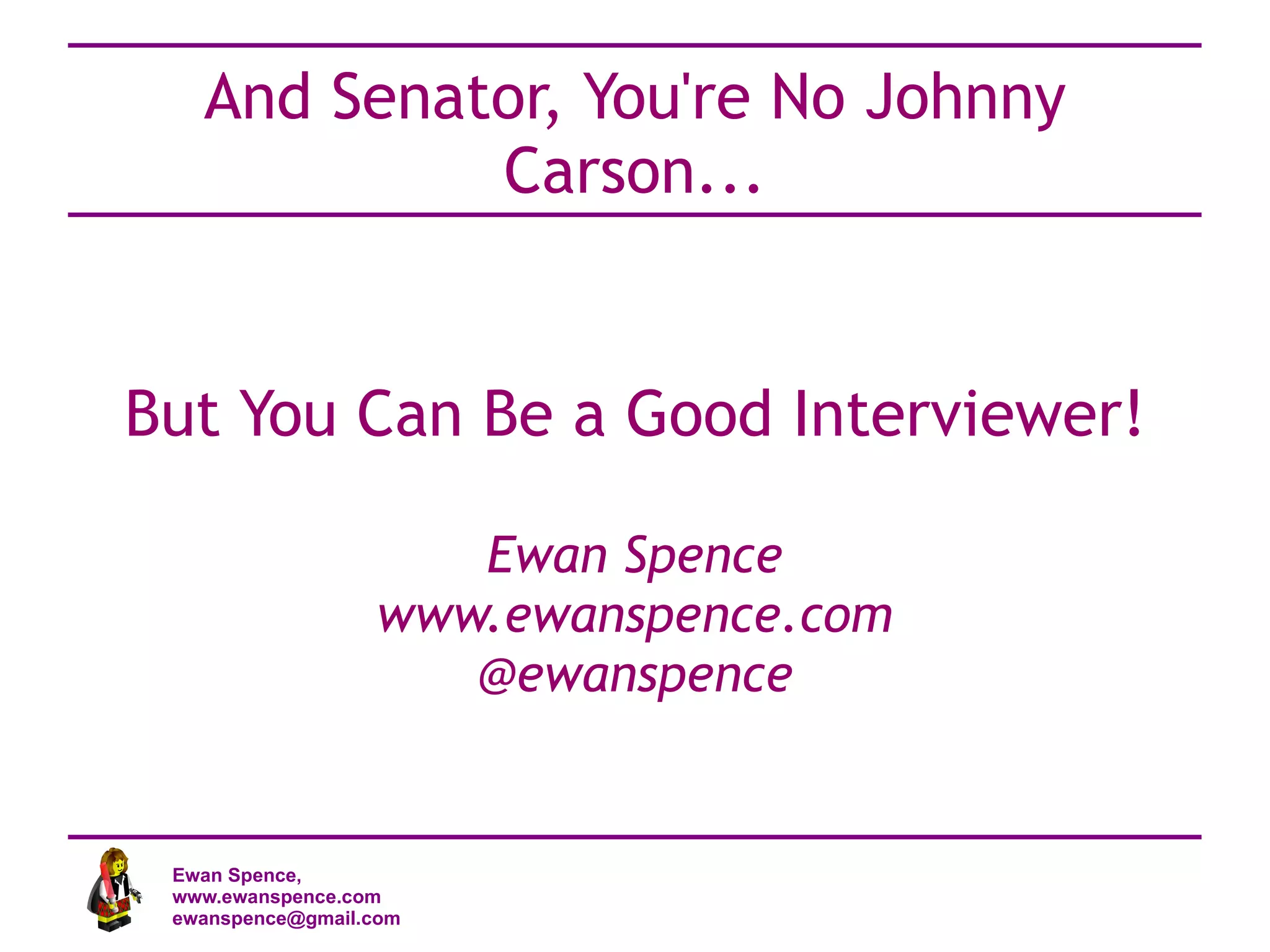 This document provides guidance for conducting effective interviews. It discusses preparing for interviews by researching guests and their topics, relaxing guests during initial meetings, focusing questions to guide conversations, and editing interviews to highlight guests while maintaining natural flow. The overall message is that with practice, observation of other interviewers, and focus on guests, one can become a skilled interviewer.