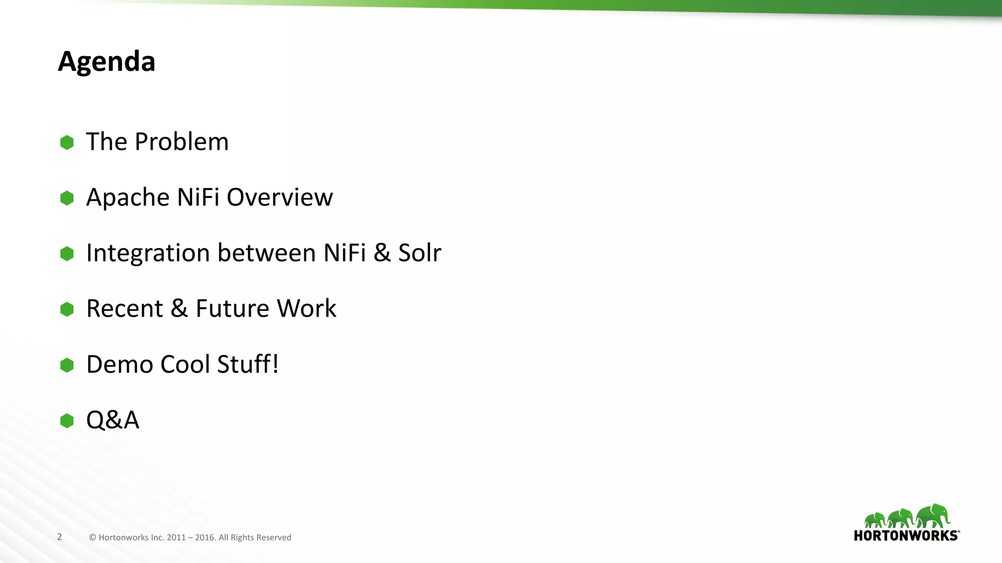 The document presents an overview of Apache NiFi, a tool designed to facilitate global enterprise data flow by addressing challenges related to data formats, protocols, and security. It discusses key features of NiFi, including visual command and control, data lineage, prioritization, and integration with Solr for data management. Recent developments and future improvements in NiFi, such as enhanced record processing and a variable registry for better parameter handling, are also highlighted.