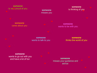 This document contains a series of statements expressing how someone cares about, thinks about, wants to be with, or needs the reader. It suggests that by sharing the document with others, the reader will find love and happiness. It encourages visiting other websites to find similar inspirational messages and files.