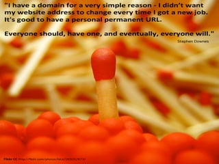 This document discusses managing your online identity and digital footprint. It addresses who currently manages your online presence and information, and encourages taking more control over what information is shared publicly and how your digital identity can be shaped. It highlights how digital information is easily copied and shared, and stresses the importance of first impressions online through search results and social media profiles.