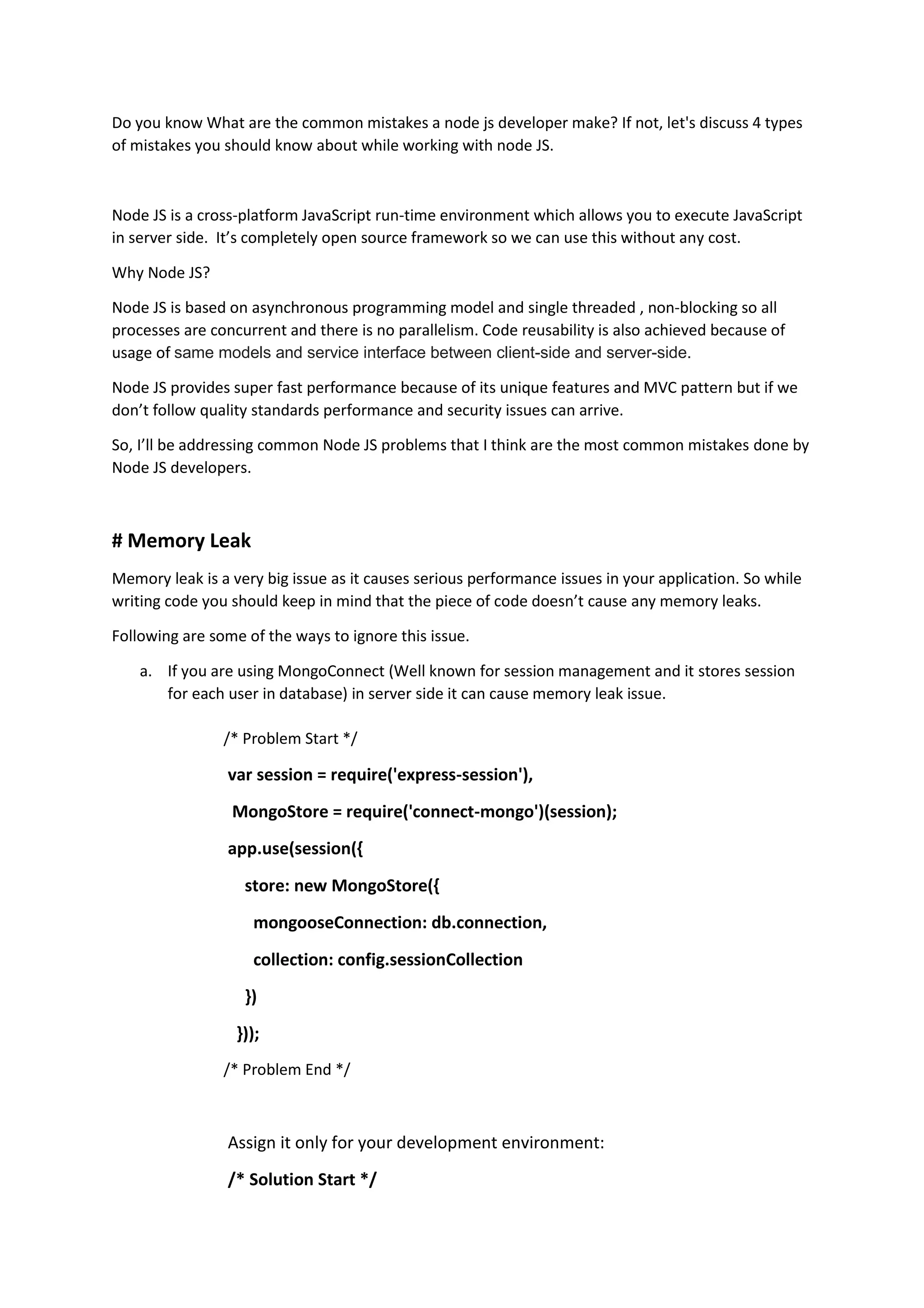 The document discusses four common mistakes made by Node.js developers: memory leaks, duplicate code, unused code and variables, and ignoring existing libraries. It emphasizes the importance of clean and reusable code to enhance performance and maintainability. To avoid these issues, developers should follow best practices such as using 'strict mode', writing middleware for shared functionality, and leveraging built-in libraries.