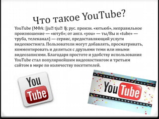 YouTube — это видеохостинг, на котором пользователи могут загружать, просматривать и делиться видео, ставший третьим по популярности сайтом в мире. Платформа оказала значительное влияние на медиаиндустрию, включая телевидение, и предоставляет возможности для независимых телеканалов. YouTube поддерживает загрузку видео максимальным размером до 100 ГБ и обладает высокими параметрами качества изображения.