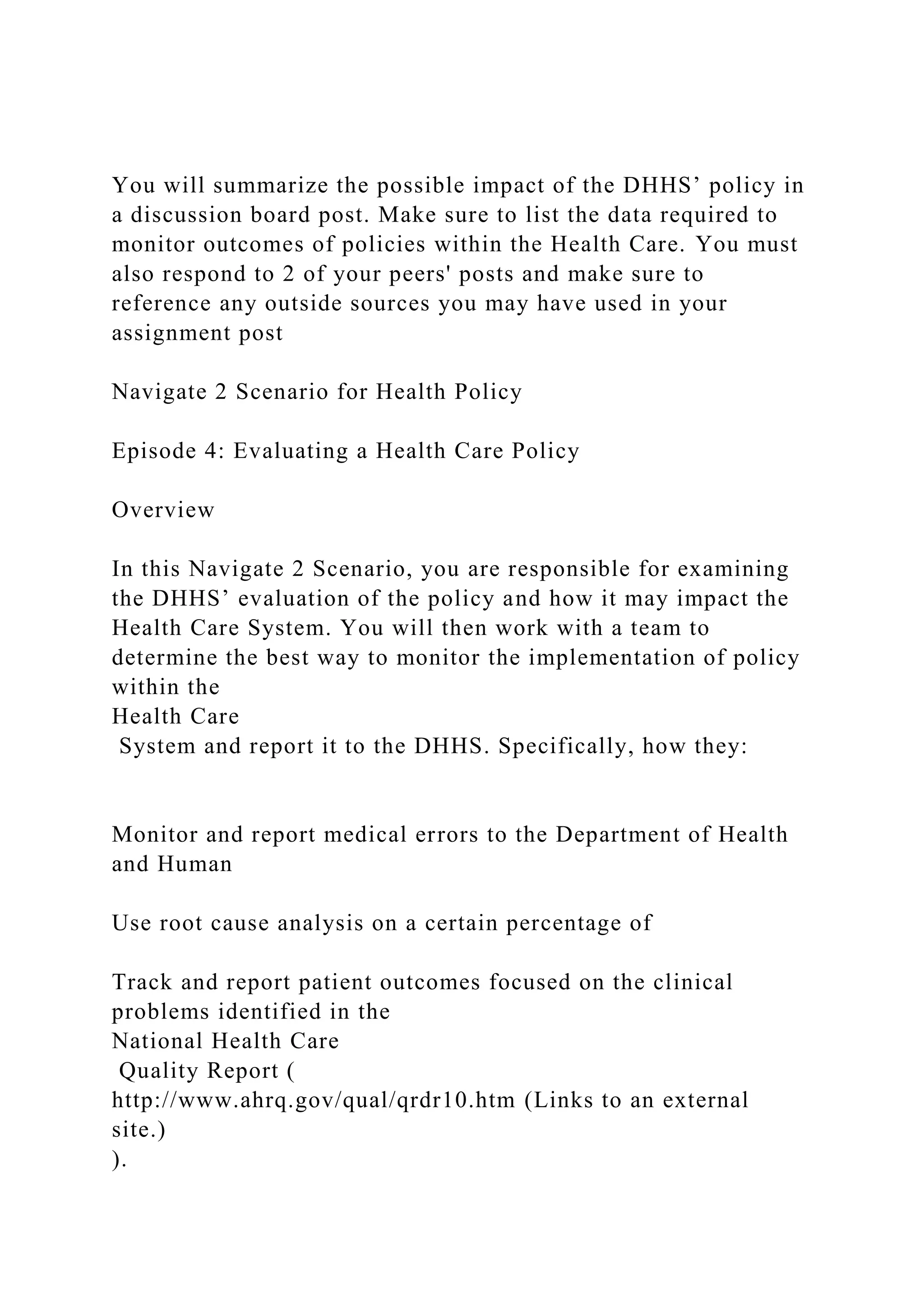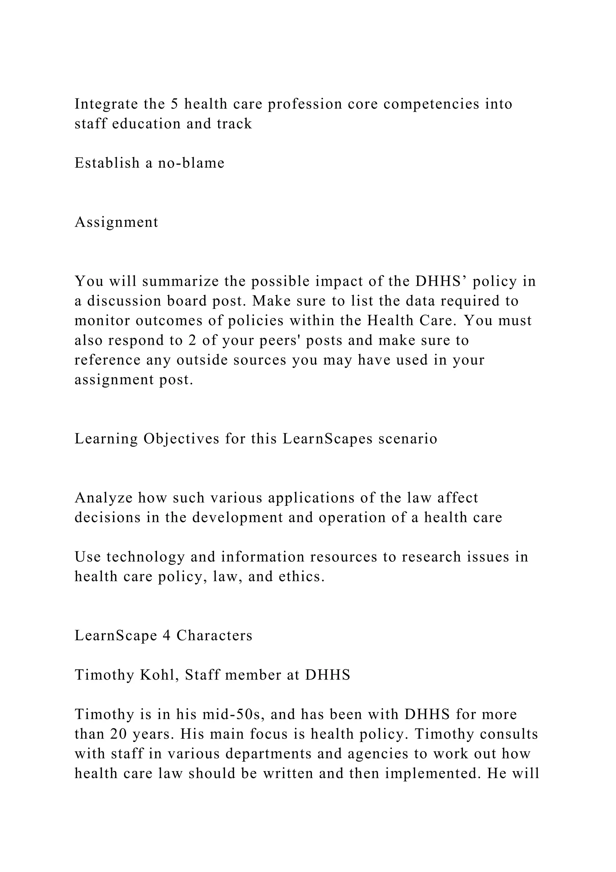 The document outlines the requirements for evaluating a DHHS policy's impact on healthcare, including data monitoring for policy outcomes and the need for collaborative team efforts in reporting findings. It emphasizes the necessity of monitoring medical errors and integrating healthcare competencies into staff education. Key characters involved are Timothy Kohl from DHHS, and Tiffany Halpert, Ken Bloom, and Ronald Baxter from Bright Road Health Care System, each with distinct roles and backgrounds.