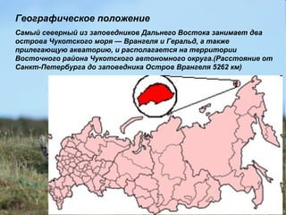Заповедник острова Врангеля, расположенный в Чукотском море, представляет собой крайний северный заповедник Дальнего Востока с арктическим климатом и разнообразным рельефом, включая три параллельные горные цепи. Флора насчитывает более 310 видов сосудистых растений, среди которых есть субэндемики и эндемики, в то время как фауна ограничена из-за суровых условий, с несколькими видами птиц и млекопитающих, включая белых медведей и северных оленей. Водные ресурсы включают более 140 рек и около 900 озёр, большинство из которых термокарстовые.