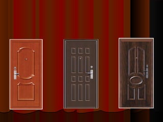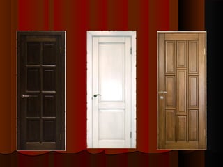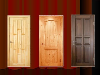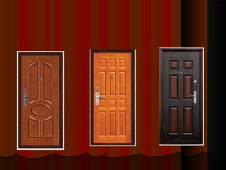 Документ описывает современные входные и межкомнатные двери, их конструкцию, материалы и дизайн. Входные двери часто изготавливаются из металла с тепло- и звукоизоляцией, а межкомнатные — из массива древесины или срощенного дерева. Также рассматриваются различные механизмы открывания дверей, их оформление и значимость в обеспечении безопасности и эстетики пространства.