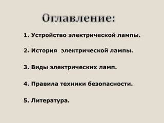 Документ описывает устройство и историю электрической лампы, включая основные виды и развитие технологий. Он охватывает важные моменты, такие как изобретения различных ученых и инженеров, начиная с первой лампы накаливания в 1809 году и до современных типов ламп, включая особенности их работы и техники безопасности. Также рассматривается эффективность ламп разного типа, с акцентом на преимущества светодиодных ламп по сравнению с лампами накаливания.