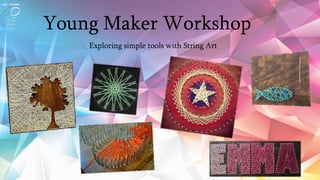 The document outlines a young maker workshop focused on creating string art using simple tools and materials. Participants learn to create their designs by plotting points for nails on graph paper and securing templates, leading to the final creation through various string patterns. It also encourages further engagement through provided website links for more maker activities.