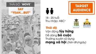 Tài liệu phân tích thói quen và cảm xúc của nhóm tuổi 18-25 đối với việc tập thể dục, nhấn mạnh cảm giác khó chịu và sự ngại ngùng khi tập gym. Đề xuất sử dụng âm nhạc vui tươi như một hình thức phân tâm tích cực giúp giảm bớt cảm giác mệt mỏi và tăng sự hứng thú với hoạt động thể chất. Kế hoạch triển khai trong 4 tuần được thiết lập để tạo ra một phong trào 'fun hunter' nhằm thúc đẩy sự tham gia và kết nối với thương hiệu.