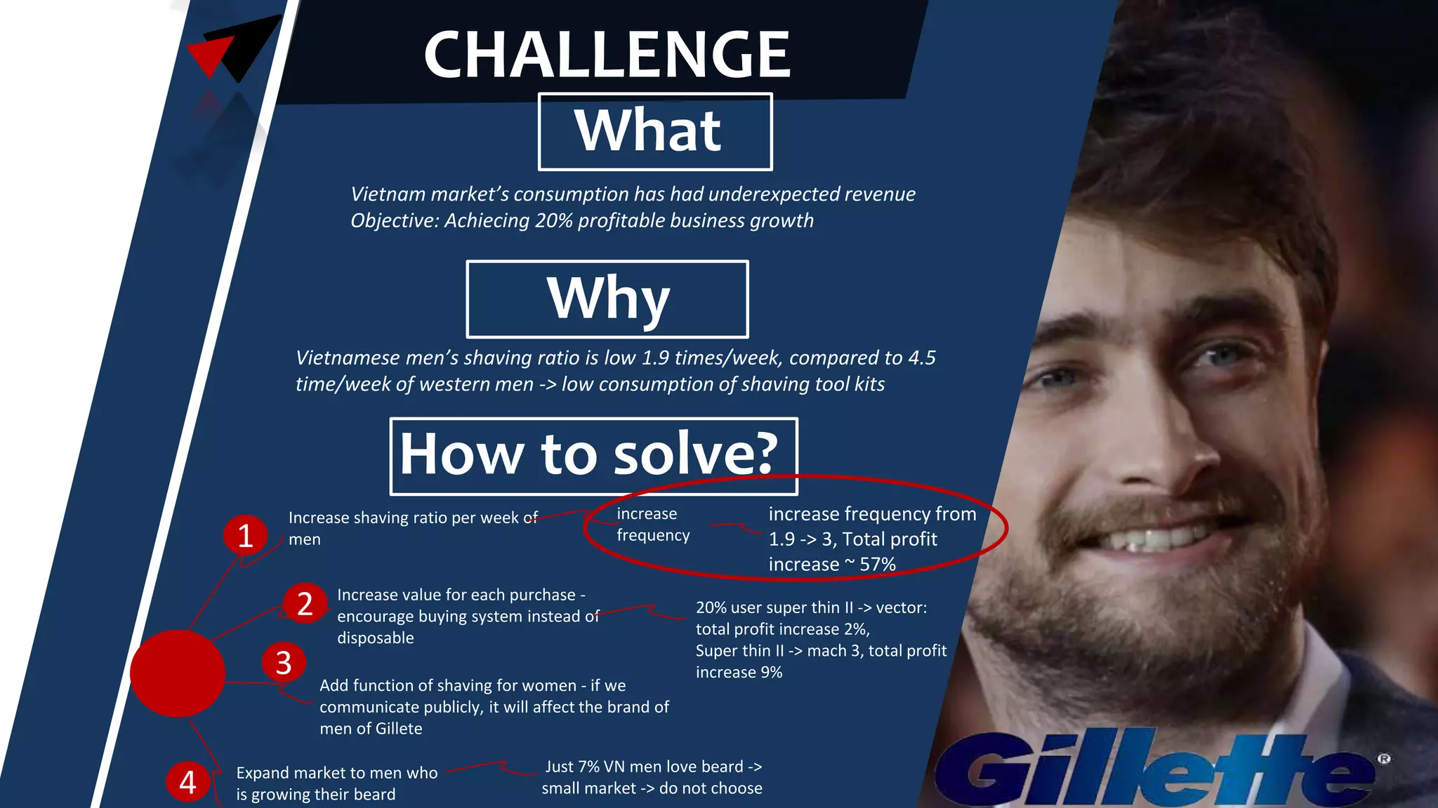 The document discusses strategies to increase Gillette's market share in Vietnam. It analyzes consumer segments and identifies "often clean-shaven" men as the primary target. The strategy is to position Gillette as making men "always ready" to seize opportunities by being cleanly shaven. A three phase execution plan includes (1) TV ads showing men getting opportunities after shaving, (2) a mobile app and reminders, and (3) an event to introduce a "new ready men generation" and distribute new Gillette razors. Trade marketing tactics are also mentioned. The overall aim is to increase shaving frequency among Vietnamese men from 1.9 to 3 times per week to boost Gillette's profits by 57%.