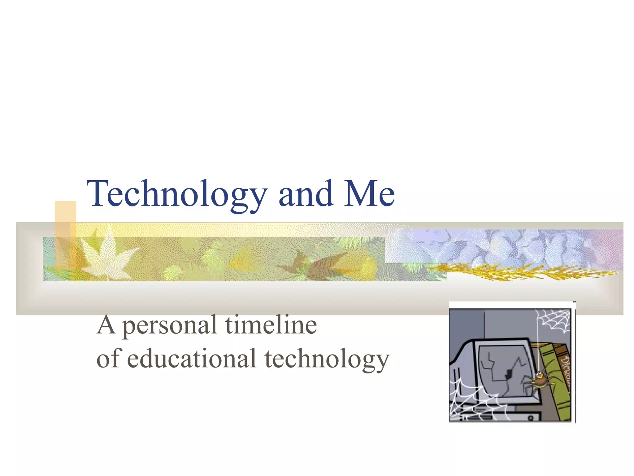 The document provides a personal timeline of Sam Young's experiences with educational technology from kindergarten in the 1960s through college in the late 1970s. It discusses the limited technologies available at each level, such as blackboards and mimeograph machines in kindergarten, slide rules in high school, and mainframe computers in college. The document also lists three websites that discuss the history of educational technology and expresses Sam's vision for using more modern technologies like internet connectivity and online collaboration in the future classroom.