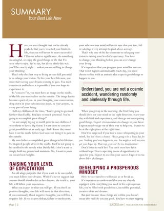 This document provides a summary of Joel Osteen's best-selling book "Your Best Life Now". In 3 sentences: The book outlines a 7-step process for reaching one's full potential that includes enlarging your vision, developing a prosperous mindset, choosing positive thoughts, and deciding to be happy each day. It emphasizes controlling your thought life, as thoughts determine actions and destiny. The final step is choosing happiness daily regardless of circumstances by enjoying each moment and not allowing problems to dictate your emotions.