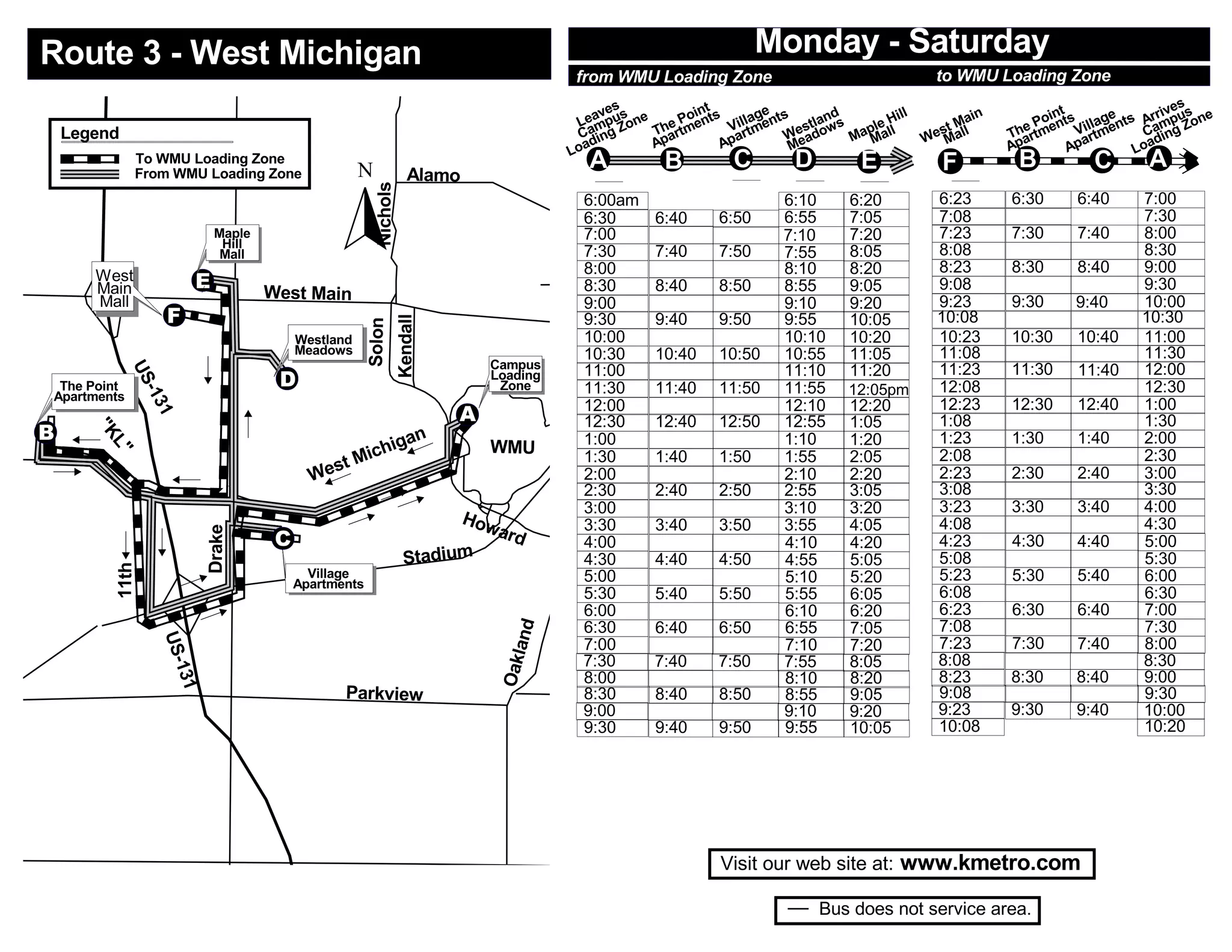 Route 3 operates Monday through Saturday from the WMU Loading Zone to the WMU Loading Zone. The route makes stops at the following locations according to the schedule: