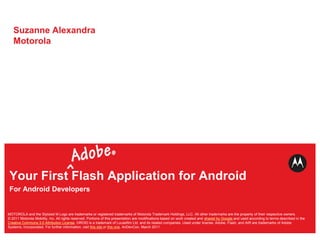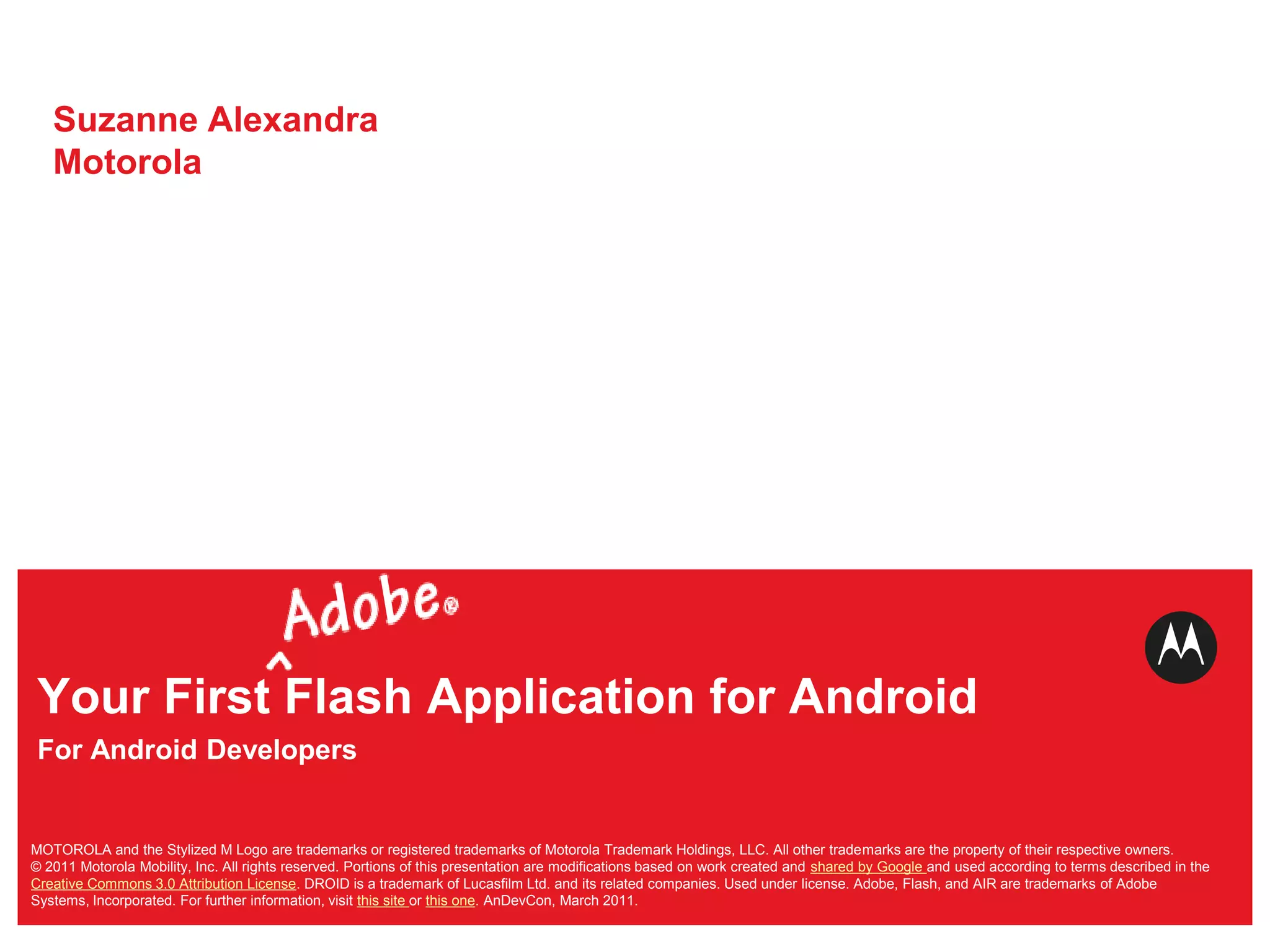 This document provides an overview of developing the first Flash application for Android, including why to use Adobe AIR, how to access device features from Flash, and the development process using Flash Builder and debugging on devices. It compares ActionScript and Java syntax, demonstrates building a simple app, and addresses questions about the activity lifecycle, back button handling, and screen resolution detection.