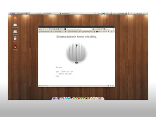 This document provides instructions for creating a basic Sinatra web application in Ruby in under 2 minutes. It discusses installing Ruby and the Sinatra gem using RVM and Bundler. It then provides a step-by-step guide to creating a Sinatra application file that defines two routes and testing the application locally. The document promotes Sinatra as a simple yet powerful framework for building RESTful APIs, demos, and minimal applications quickly.