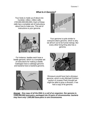 The human genome consists of DNA containing 3 billion base pairs that provide instructions for building and maintaining a human being. The genome is found in almost every cell and is organized into 23 pairs of chromosomes. The DNA code uses four chemical bases (A, C, G, T) to form sequences that are translated into proteins through units called genes and codons. While genes code for proteins, much of non-coding DNA is still not fully understood. The goal of the Human Genome Project was to map the entire human genome sequence to further understand human health and disease.