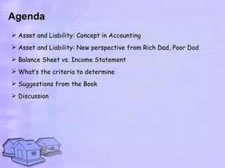 The document discusses the concepts of assets and liabilities from the perspective presented in the book "Rich Dad, Poor Dad". An asset is traditionally defined in accounting as something that generates future economic benefits, while a liability is an obligation that requires money to be paid out in the future. However, the book provides an alternative view of an asset as something that generates a positive cash flow and income, while a liability generates a negative cash flow and expenses. It suggests determining if a house is an asset or liability based on comparing its costs to potential rental income it could generate. The document concludes by summarizing some of the book's suggestions, such as focusing on assets first and letting money work for you.