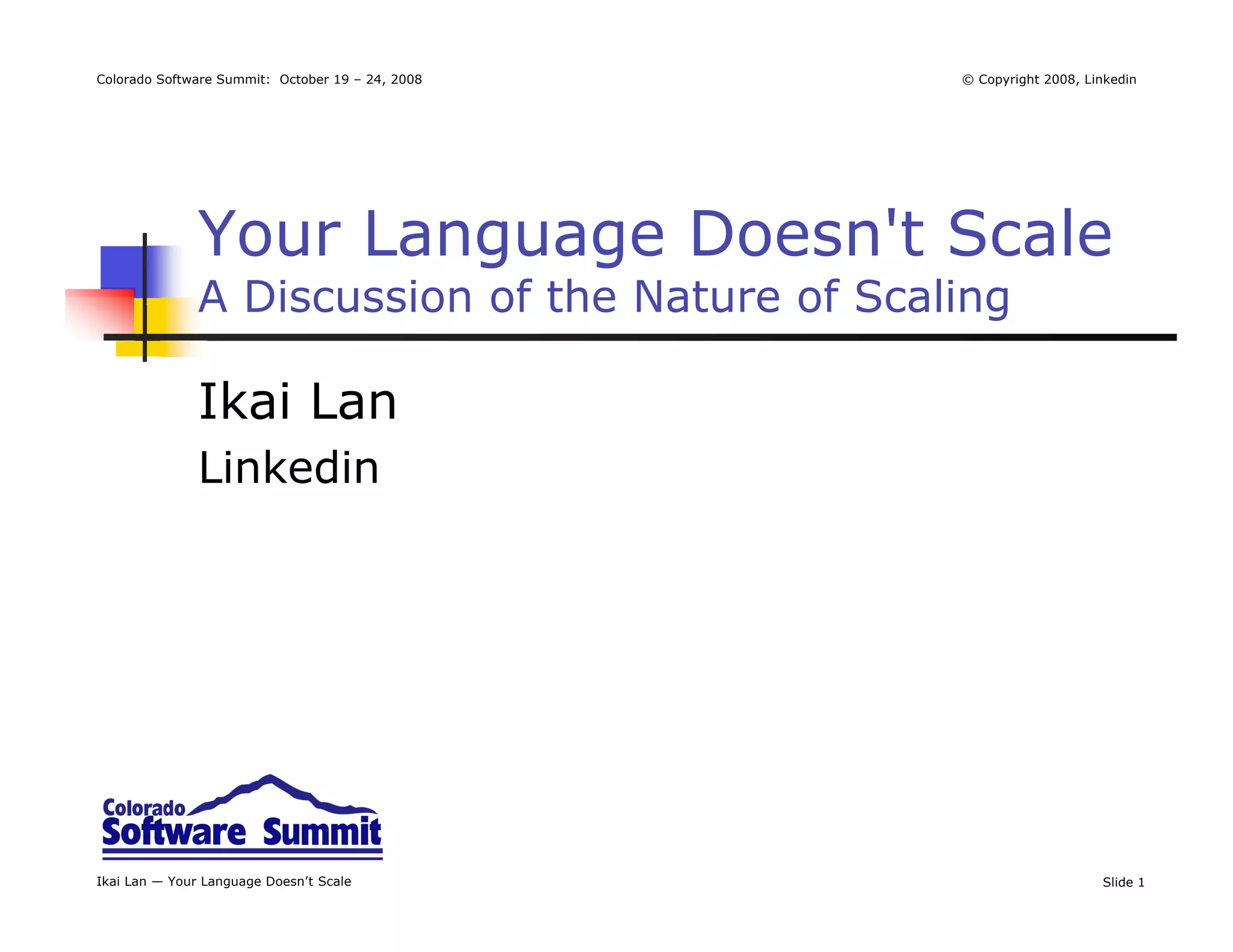 Ikai Lan's presentation at the Colorado Software Summit discusses the challenges of scaling web applications, particularly focusing on flaws in using Ruby on Rails due to its speed and rendering limitations. He emphasizes that scalability differs from efficiency and performance, highlighting the distinction between vertical and horizontal scaling methods. The talk illustrates practical challenges, such as bottlenecks and data replication problems, encountered during the scaling process.