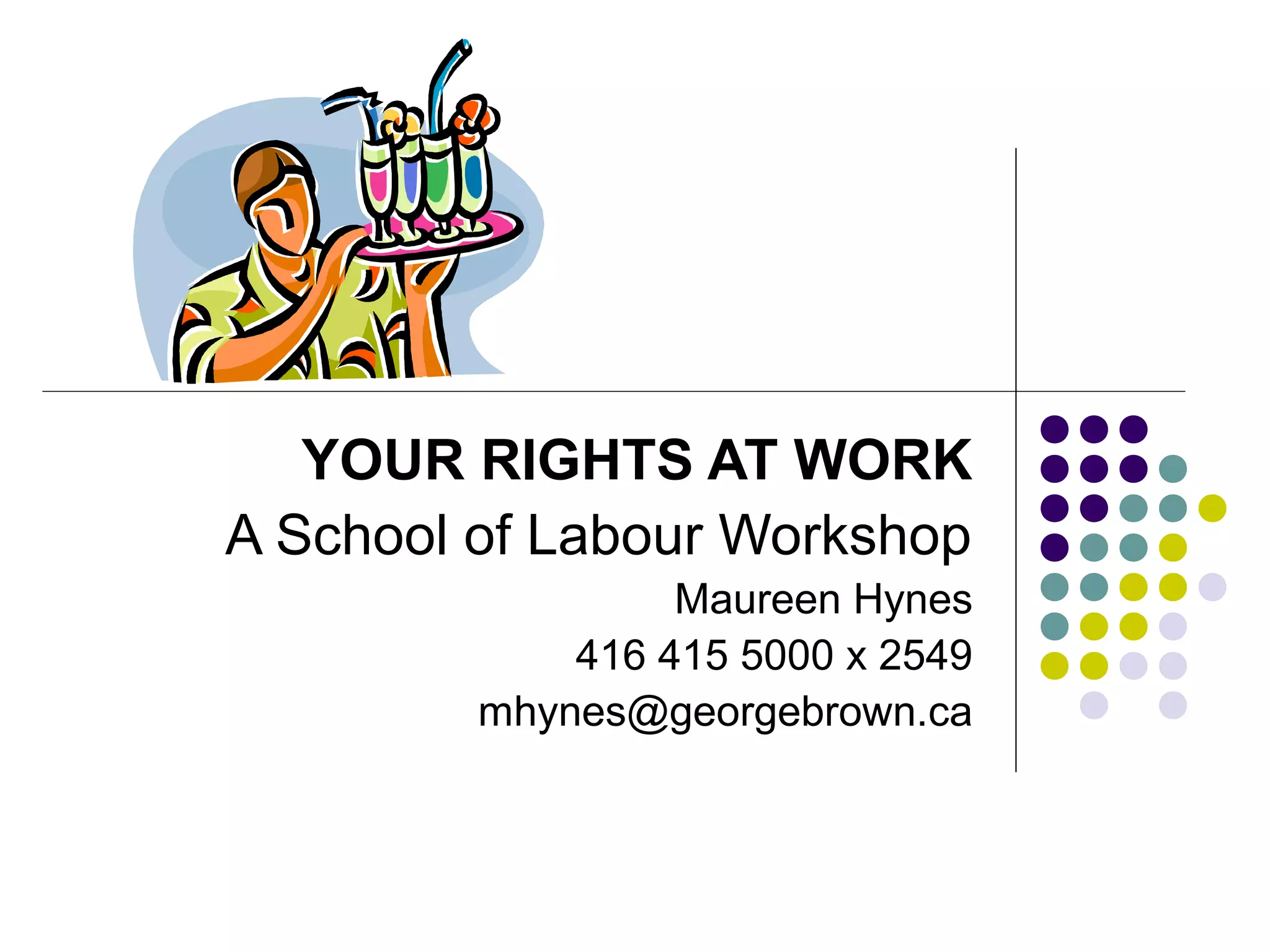 This document outlines basic workplace rights in Ontario, Canada. It explains 14 key rights including minimum wage, hours of work, overtime pay, vacation time, leaves, and termination procedures. The document is intended to help workers understand their legal protections and how to resolve disputes if their rights are violated.
