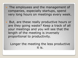 The document provides tips for making team meetings more effective and productive. It suggests keeping meetings short and simple, having a clear agenda sent in advance, using oval mapping to categorize discussion points, allowing all participants to contribute equally, and sending around minutes to solidify decisions and next steps. The overall message is that meetings should be carefully planned and facilitated to avoid wasted time and ensure all attendees can contribute to meaningful discussions.