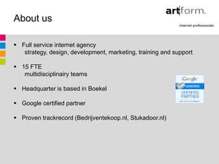 This document outlines Ross Doyle's website roadmap presentation for Avans students. The presentation covers preparing for a website build by understanding business goals and competitors, different website strategies and types, web design principles, development approaches, optimizing conversions, search engine marketing tactics, using analytics to understand users, and tools that can help along the way. The goal is to provide guidance on all aspects of building, marketing, and improving a website.