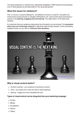 Visual content such as images, videos, and infographics is becoming increasingly important for online marketing. As visual information makes up a large portion of what our brains can process, visual content is more engaging and shareable than text-based content. Marketers must create visual content that supports their written content in order to be successful across various online platforms and social media channels. Both visual and written content are needed to provide a good customer experience and drive traffic, engagement, and conversions.