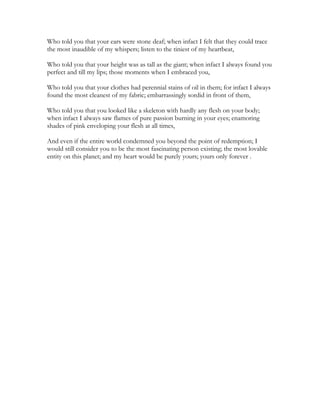 This poem refutes negative things others may have said about the person's beauty and qualities. Over 12 lines, the speaker asks "who told you" negative qualities such as being ugly, fat, or having swollen lips, before asserting that to them the person is beautiful in a variety of ways such as having golden honey hair, passionate breath, and skin as resplendent as a lotus. The speaker says that even if the whole world condemned the person, to them they would still be the most fascinating and lovable person, with the speaker's heart belonging to them forever.