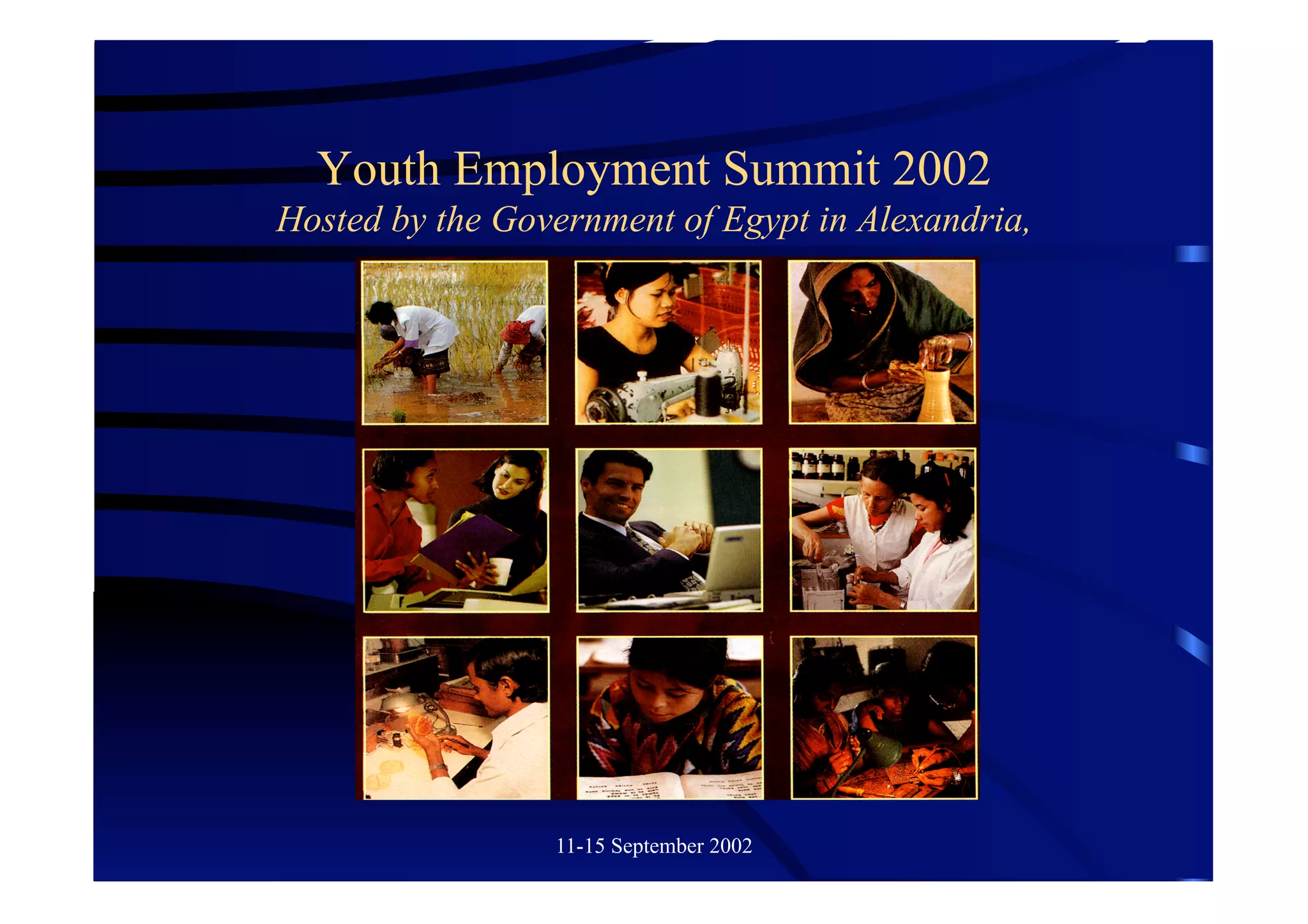 The document summarizes information about the Youth Employment Summit 2002 hosted by the Government of Egypt in Alexandria from September 11-15, 2002. The summit aimed to launch a global campaign to provide productive livelihoods for an additional 500 million young adults, especially those facing poverty, by the year 2012. It outlined the summit's goals, mission, partners, and organizing committee members.
