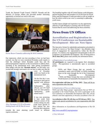 2) News and updates from various UN offices, including information on registration for the Rio+20 conference, a new climate change and lifestyles guidebook, and grants from the UN-HABITAT Urban Youth Fund.