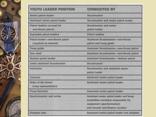 This document outlines the Youth Leadership Training Continuum used in Boy Scouts, which includes Troop Leadership Training (TLT) at the troop level, National Youth Leadership Training (NYLT) at the council level, and National Advanced Youth Leadership Experience (NAYLE) at the national level. It focuses on TLT, which is conducted by the Scoutmaster and Senior Patrol Leader. TLT includes three one-hour modules that teach youth leaders about their roles and responsibilities, how to fulfill their positions effectively, and what is expected of them as leaders. The goal is for Scouts to understand leadership, be able to work as a team toward a shared vision of success, and empower their patrol members through servant leadership.