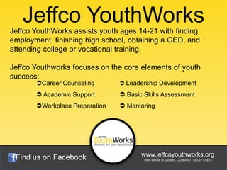 Jeffco YouthWorks provides services to help youth ages 14-21 obtain their GED, find employment, and pursue further education or training. They offer academic support, career counseling, job coaching, financial assistance, and connections to local employers in order to give youth the skills and resources needed to succeed in the workplace or in college.