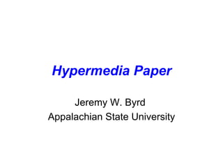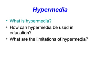 The document discusses hypermedia, defining it as a computer-based information retrieval system that allows users to access and link multimedia content related to a particular subject. It notes that hypermedia has evolved over time to become more advanced than earlier versions but also represented a revolution in organizing information compared to traditional linear formats. The document questions how vast amounts of information, like that contained in the Library of Congress or NASA, can be organized for access.