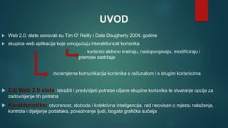 Web 2.0 alati, osnovani 2004. godine, omogućavaju interaktivnost korisnika kroz aktivno kreiranje i dijeljenje sadržaja, s ciljem zadovoljenja potreba ciljane skupine. E-obrazovanje koristi ove alate za inovaciju nastavnog procesa, potičući kreativnost i suradničko učenje učenika. Iako donose mnoge prednosti, kao što su povećana motivacija i lakši pristup informacijama, postoji i rizik od negativnog sadržaja te potrebe za edukacijom učitelja o pravilnoj uporabi ovih tehnologija.