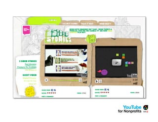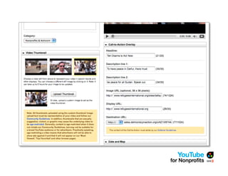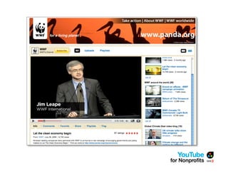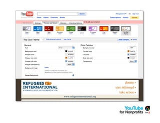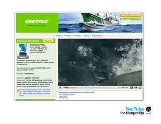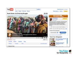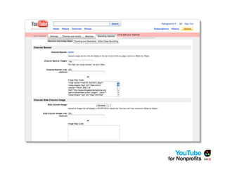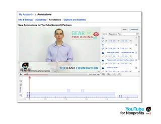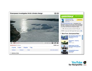 The document outlines a webinar by See3 Communications focused on the importance of a YouTube strategy for nonprofits, detailing effective online communication, fundraising techniques, and technical considerations. It covers key planning questions, content ideas for YouTube, and the nonprofit program's eligibility and benefits. Additionally, it provides advice on video production, measurement of success, and useful tools for maximizing online presence.