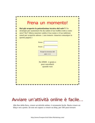 Il documento illustra come il video marketing su YouTube possa inondare un sito web di clienti, senza necessità di apparire professionisti. Sottolinea l'importanza di generare traffico di qualità e propone un videocorso, 'free-per-click video marketing', come soluzione per ottenere risultati in modo semplice ed efficace. Il corso offre strategie specifiche per aiutare anche i principianti a monetizzare le attività online attraverso il video marketing.