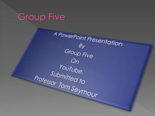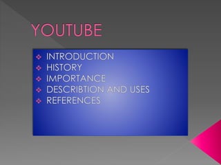YouTube is a video sharing website launched in 2005, created by Chad Hurley, Steve Chen, and Jawed Karim after they struggled to share a dinner party video online. It became popular for allowing users to easily upload and watch videos. The company was funded $11.5 million by Sequoia Capital in 2005-2006. YouTube offers an enormous library of entertaining, informative and preview videos uploaded by users and is a popular site for watching video content online.