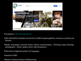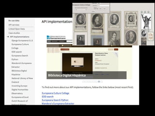 This document discusses strategies for increasing usage of digitized collections after initial digitization. It recommends (1) ensuring content is indexed by search engines like Google, (2) having clear licensing for how content can be reused, and (3) making access and downloading content as easy as possible. The document also suggests (4) building APIs to allow others to build tools using the content, (5) networking with organizations like Europeana and The European Library to expose content more broadly, and (6) considering new projects around 20th century history or connecting usage data.
