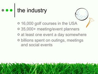 This document summarizes a business partnership opportunity with Golf Event Management, LLC and yourperfectcourse.com to help event planners connect with golf courses and venues for outings, meetings, and social events. It notes there are over 16,000 golf courses in the US and billions spent annually on such events. The opportunity allows event planners to submit a comprehensive request for proposal form to yourperfectcourse.com, who will then deliver qualified venue opportunities directly to the planner. There are no commissions or fees for the planner, providing access to thousands of public and private golf venues locally, regionally, and nationally.