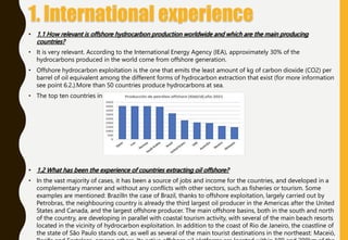 Offshore hydrocarbon production is crucial, contributing to about 30% of global outputs, with leading countries like Brazil, Norway, and Qatar showing positive socioeconomic impacts and limited environmental incidents. Notably, recent significant oil discoveries in Africa may drive technological advancements, while Argentina's offshore activity has historically included various explorations, primarily in shallow waters. The document highlights regulatory frameworks, environmental considerations, and the ongoing evolution of offshore practices in different regions.